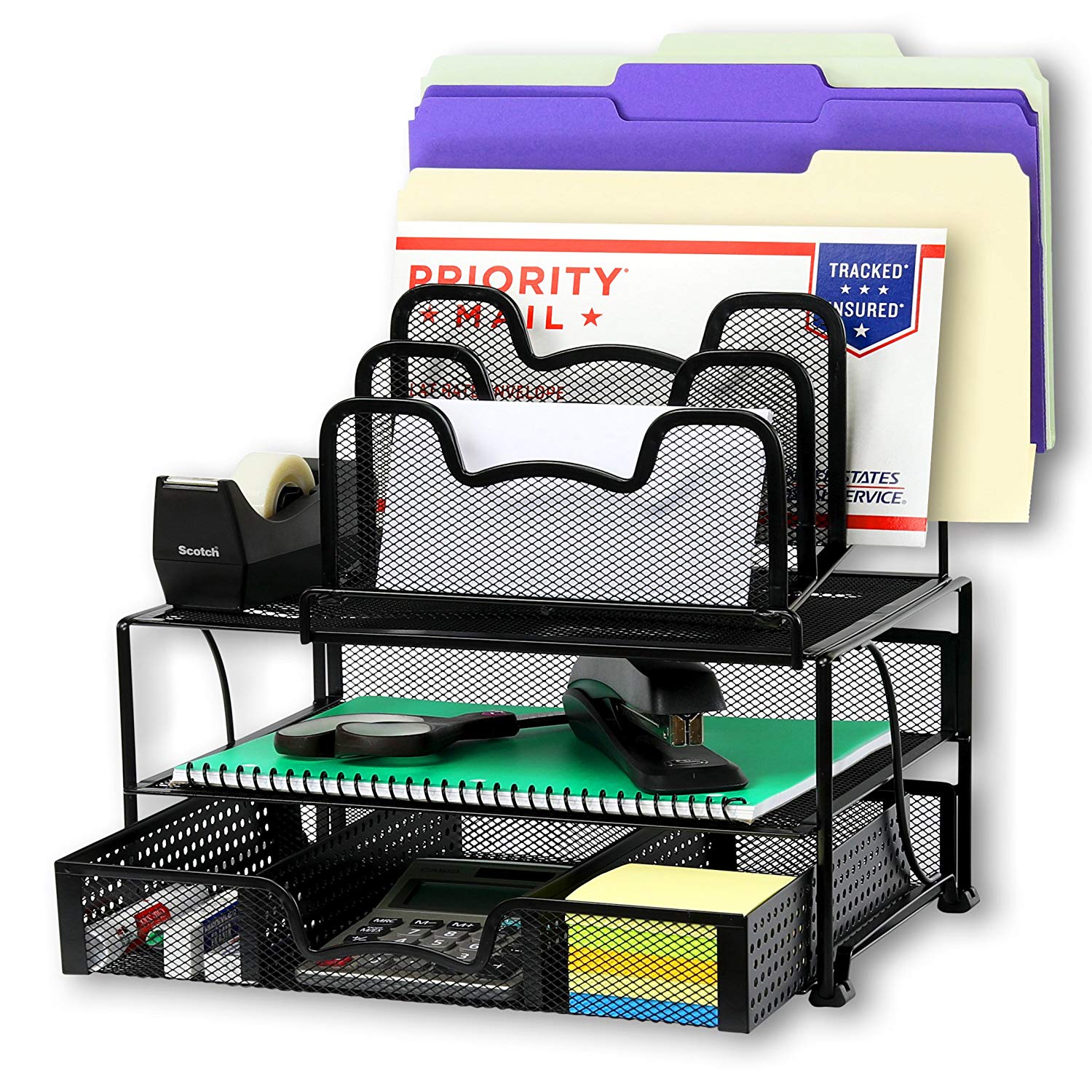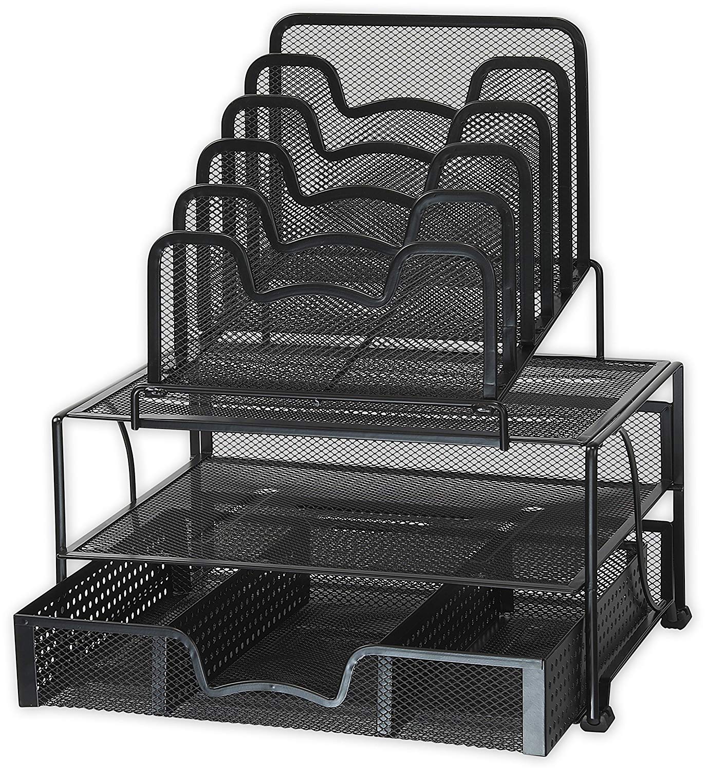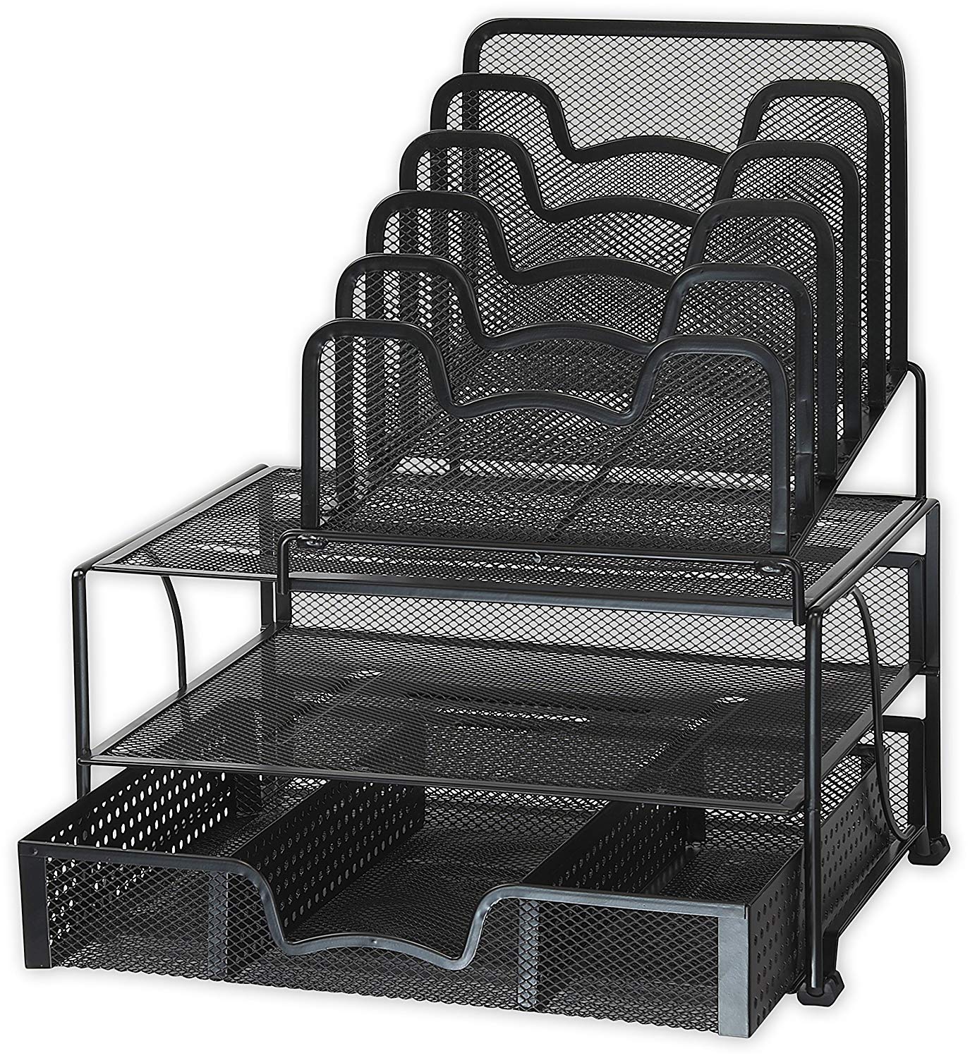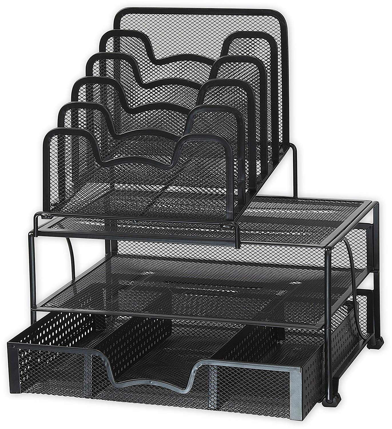Product description Color:Black SimpleHouseware Mesh Desk Organizer with Sliding Drawer, Double Tray and 5 Stacking Sorter Sections, Black